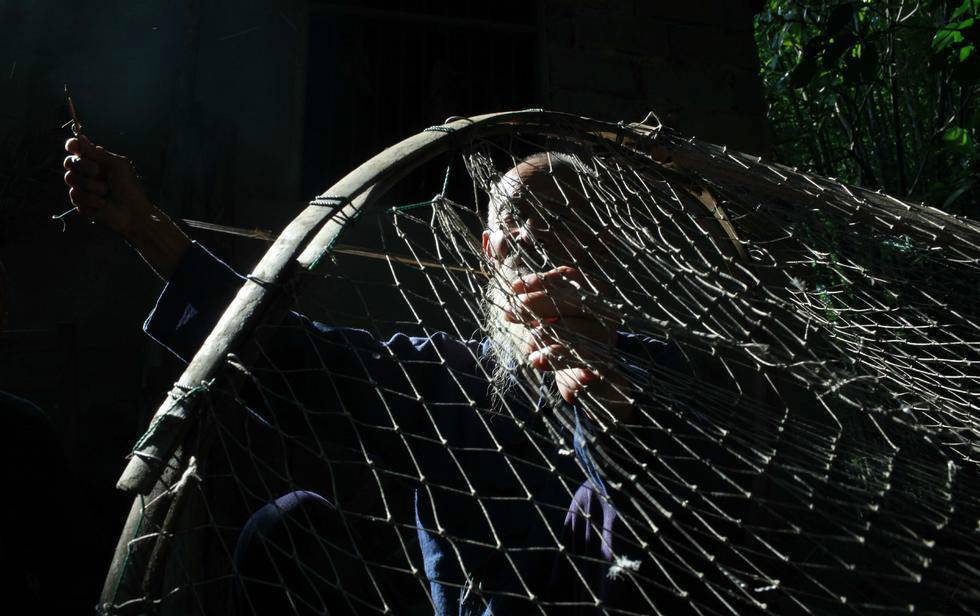在配合摄影师拍照时,常需要撒网,展现千百年来,漓江渔翁延续千年的捕鱼场景,这也使鱼网破坏严重,他们几乎每天都要对鱼网进行修补。