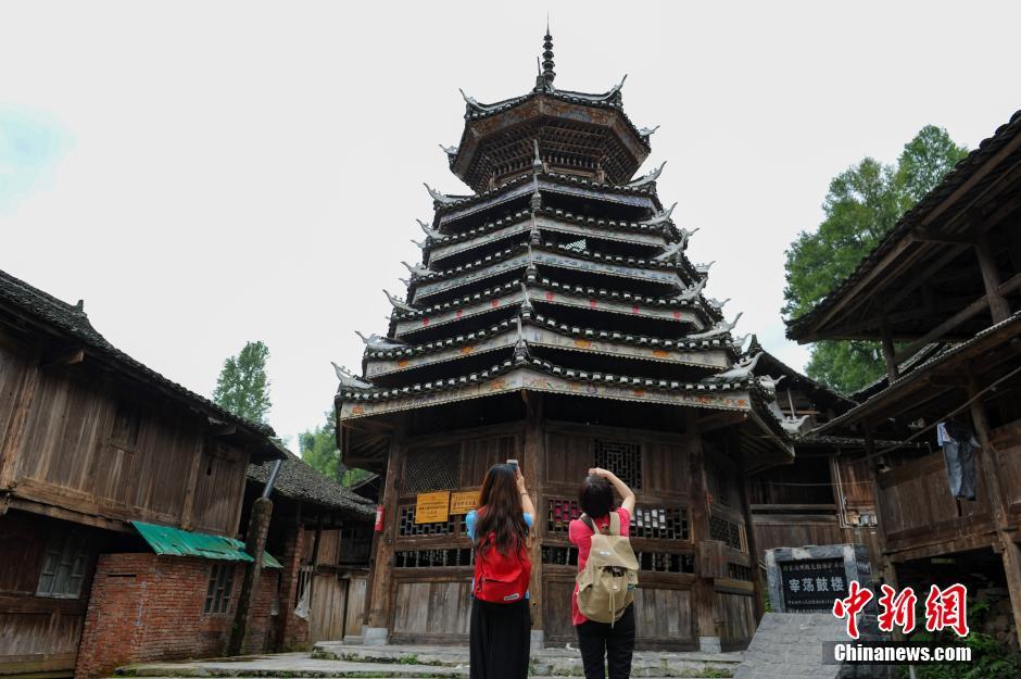 5月31日,两位游客在宰荡侗寨中鼓楼前拍照。宰荡侗寨位于贵州省榕江县,居于此地的侗族属于榕江侗族6大支系之一,这里的侗族建筑独具特色,其中“干栏”楼房体现的是侗族传统的建筑风格。村中一座鼓楼,建于清朝乾隆年间,为单檐歇山顶民居式木瓦结构建筑,楼高12米。宰荡侗寨是著名的侗族大歌之乡,目前有侗族大歌国家级传承人1名。宰荡侗寨于2012年入选中国第一批传统村落名录。中新社记者贺俊怡 摄