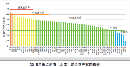 2015年,开展营养状态监测的61个湖泊(水库)中,贫营养的6个,比2014年减少4个;中营养的41个,比2014年增加5个;轻度富营养的12个,比2014年减少1个;中度富营养的2个,与2014年持平。