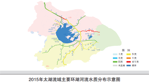 环湖河流34个国控断面中,无Ⅰ类水质断面,与2014年持平;Ⅱ类占2.9%,比2014年下降3.0个百分点;Ⅲ类占38.2%,与2014年持平;Ⅳ类占50.0%,比2014年上升17.6个百分点;Ⅴ类占2.9%,比2014年下降11.8个百分点;劣Ⅴ类占5.9%,比2014年下降2.9个百分点。