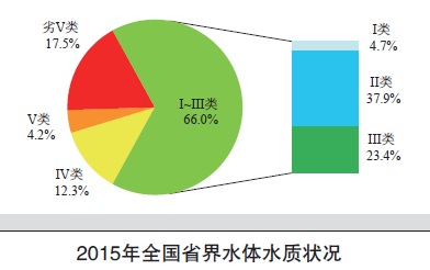 2015年,全国530个重要省界断面监测表明,Ⅰ~Ⅲ类、Ⅳ~Ⅴ类、劣Ⅴ类水质断面比例分别为66.0%、16.5%和17.5%。主要污染指标为氨氮、总磷和化学需氧量。与2014年相比(可比的517个省界断面),Ⅰ~Ⅲ类水质断面比例无变化,劣Ⅴ类水质断面比例下降1.1个百分点。