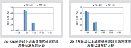 2015年,321个进行昼间监测的地级以上城市,区域声环境质量平均值为54.1 dB(A)。其中,昼间区域声环境质量为一级的城市占4.0%,比2014年上升2.2个百分点;二级的城市占68.5%,比2014年下降3.1个百分点;三级的城市占26.2%,比2014年下降0.1个百分点;四级的城市占0.9%,比2014年上升0.6个百分点;五级的城市占0.3%,比2014年上升0.3个百分点。