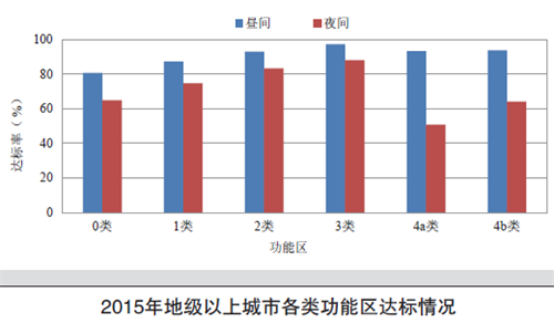 2015年,308个开展城市功能区声环境监测的地级以上城市昼间监测点次达标率平均为92.4%,比2014年上升1.1个百分点;夜间监测点次达标率平均为74.3%,比2014年上升2.5个百分点。各类城市功能区声环境质量昼间达标率均高于夜间。