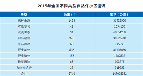 截至2015年底,全国共建立各种类型、不同级别的自然保护区2740个,总面积约14703万公顷;其中陆地面积约14247万公顷,占全国陆地面积的14.8%。国家级自然保护区428个,面积9649万公顷,约占国土面积的10.0%。