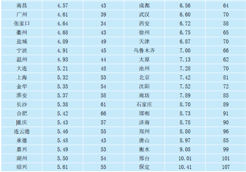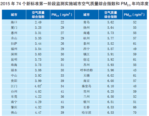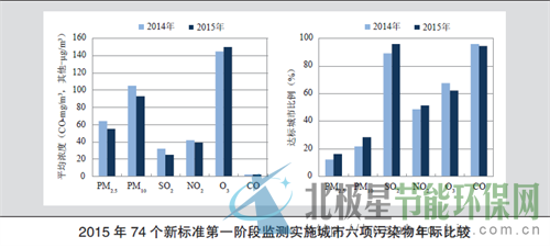 各指标分析表明,PM2.5年均浓度范围为22~107微克/立方米,平均为55微克/立方米,比2014年下降14.1%;达标城市比例为16.2%,比2014年上升4.0个百分点。PM10年均浓度范围为40~174微克/立方米,平均为93微克/立方米,比2014年下降11.4%;达标城市比例为28.4%,比2014年上升6.8个百分点。SO2年均浓度范围为5~71微克/立方米,平均为25微克/立方米,比2014年下降21.9%;达标城市比例为95.9%,比2014年上升6.7个百分点。NO2年均浓度范围为14~61微克/立方米,平均为39 微克/立方米,比2014年下降7.1%;达标城市比例为51.4%,比2014年上升2.8个百分点。O3日最大8小时平均值第90百分位数浓度范围为95~203微克/立方米,平均为150微克/立方米,比2014年上升3.4%;达标城市比例为62.2%,比2014年下降5.4个百分点。CO日均值第95百分位数浓度范围为0.9~5.8毫克/立方米,平均浓度为2.1毫克/立方米,与2014年持平;达标城市比例为94.6%,比2014年下降1.3个百分点。