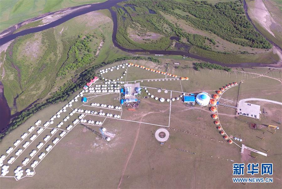 草原上蒙古包星罗棋布(6月19日摄)。内蒙古呼伦贝尔草原位于大兴安岭以西,由东向西呈规律性分布,地跨森林草原、草甸草原和干旱草原三个地带,是世界著名的天然牧场。这里地域辽阔、风景怡人,是一片难得的绿色净土。从空中俯瞰,草原、羊群、河流组成的美丽画卷令人陶醉。新华社记者邓华 摄