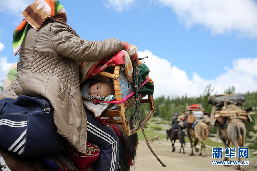 6月21日,阿勒泰市阿拉哈克镇阿拉力村牧民古丽江带着小孩骑马转场。进入六月,新疆阿勒泰地区的哈萨克牧民赶着上百万头牲畜,开始了今年的夏季大迁徙。阿勒泰是新疆四大牧区之一,每年这里的哈萨克族牧民都要赶着牛羊进行四季转场。新华社发(叶尔江摄)