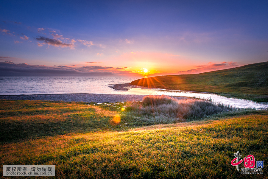 湖水随着日出的阳光色彩渐变。祁军摄