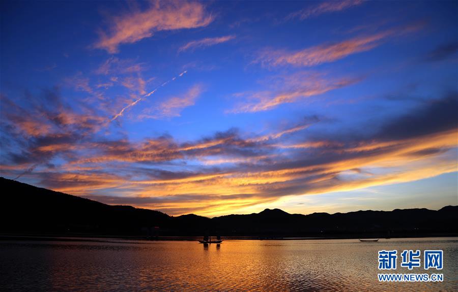 8月7日,云南滇池日落时分出现绚丽的火烧云。