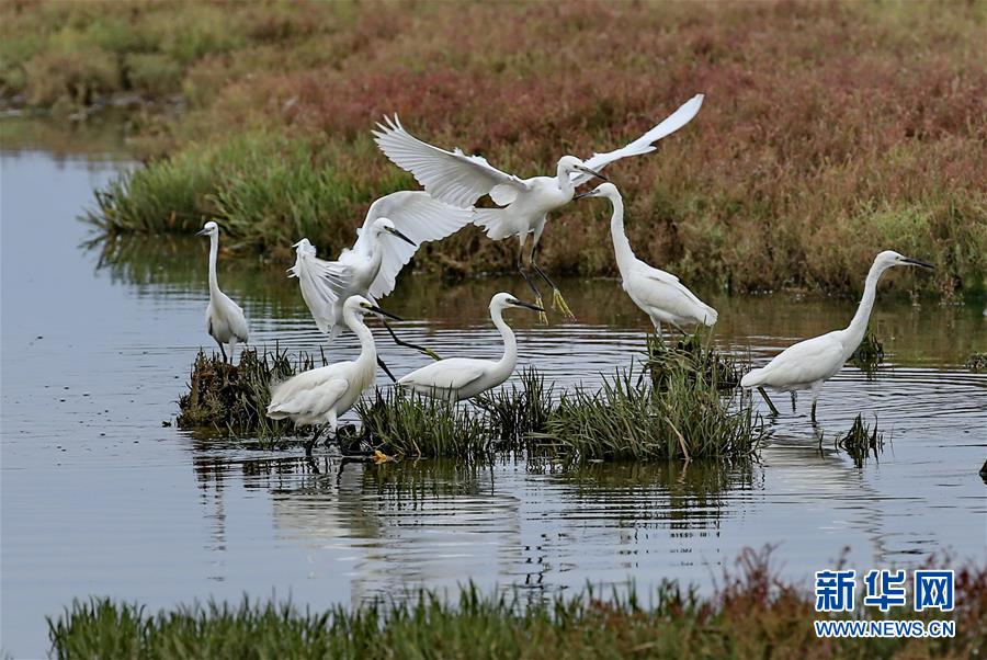 8月15日,一群白鹭雏鸟在秦皇岛市海边湿地觅食嬉戏。