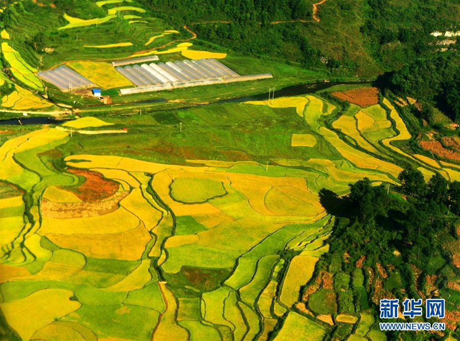 金秋时节,黄平县境内稻谷一片金黄,从空中俯瞰,青山绿水间梯田层层叠叠,美若画卷。