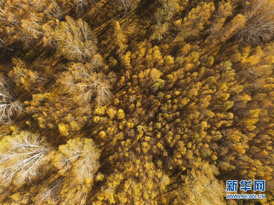 这是9月27日航拍的内蒙古赤峰市克什克腾旗乌兰布统草原秋色。秋意渐浓,广阔的草原在阳光的照耀下一片金黄。 新华社发(刘满仓摄)