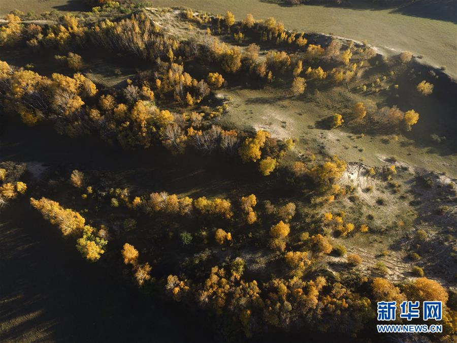 这是9月27日航拍的内蒙古赤峰市克什克腾旗乌兰布统草原秋色。秋意渐浓,广阔的草原在阳光的照耀下一片金黄。 新华社发(刘满仓摄)