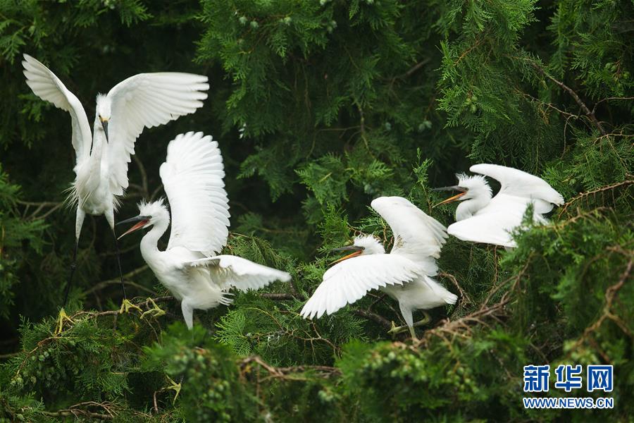 寒露时节,生活在江苏盱眙淮河河畔的白鹭沐浴秋色,或在树梢嬉戏,或翩翩起舞,给沿淮居民增添不少乐趣。