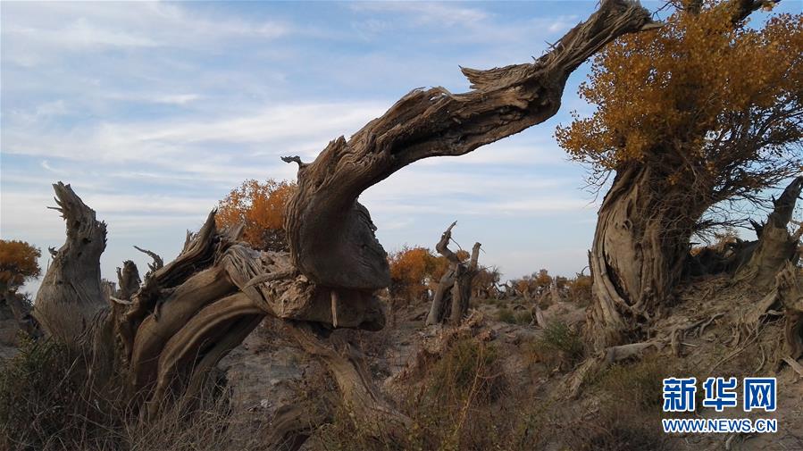 10月19日拍摄的伊吾胡杨。伊吾原始胡杨林位于新疆维吾尔自治区哈密市伊吾县淖毛湖镇东10公里处,是中国境内分布最为集中的胡杨林,也是世界仅存的三片胡杨林之一,其面积达47.6万亩,伊吾县淖毛胡的胡杨面对的考验和遭受的磨难比世界上任何地方的胡杨都要多得多。经受盐碱的浸渍腌泡,不管碱壤有多硬多厚,它的根须总是深深地扎在碱壤之下,与苦涩和烧灼进行着殊死的较量。新华社发(刘玉和摄)