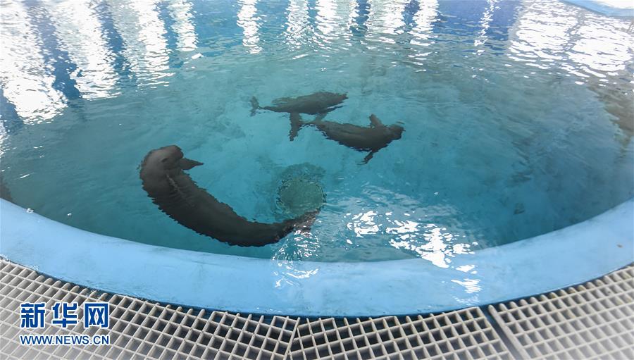 这是10月23日拍摄的三头在中国科学院水生生物研究所武汉白鱀豚馆的长江江豚。新华社记者戚恒摄