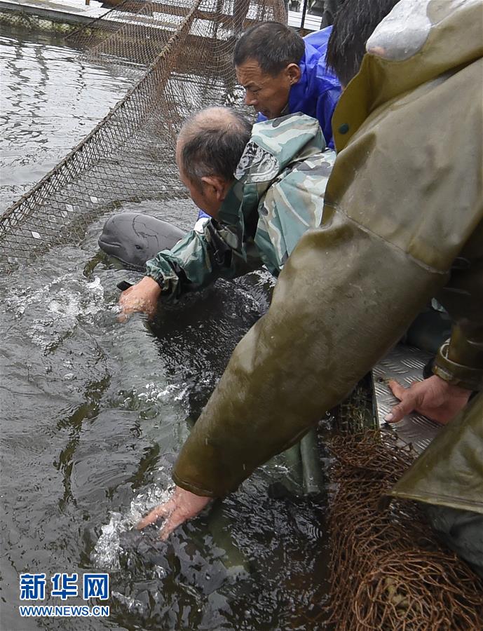 10月24日,在湖北长江天鹅洲白鱀豚国家级自然保护区,工作人员丁泽良(后)在志愿者杨家炎(中)等的帮助下,捕捞起水长江江豚“天天”准备体检。新华社记者戚恒摄
