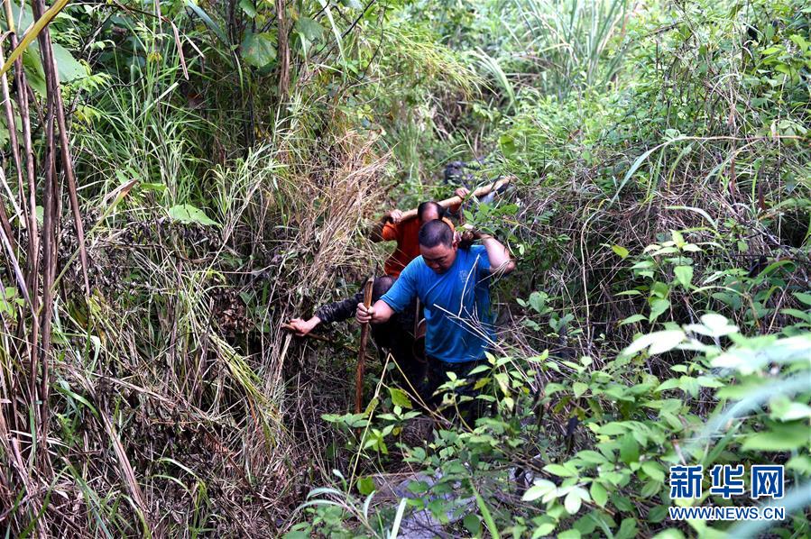 在广西大化瑶族自治县板升乡弄雷村,工人们抬着抗旱饮水工程的水管在山路上艰难前行(8月18日摄)。新华社记者黄孝邦摄