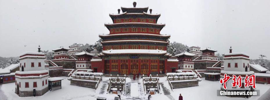 11月21日,河北承德迎来了今冬初雪,过程雪量达到暴雪,最大积雪深度为22厘米。纷纷扬扬的大雪给承德披上了洁白的外衣,世界文化遗产避暑山庄和普宁寺在银装素裹中显得格外典雅庄重。普宁寺在银装素裹中显得格外典雅庄重。 郝志伟 摄