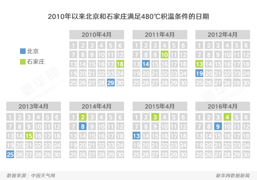 杨柳絮的始飞时间是由气温决定的,下图统计了北京和石家庄自2010年以来积温达到480℃条件的日期,石家庄4月中旬左右可以达到这个积温条件,这与石家庄杨絮平均飘飞时间为4月11日吻合。北京比石家庄纬度高些,所以气温就低些。一般来说纬度高1°,物候期要延后3至4天。所以北京杨柳絮开始飘飞时间一般要比石家庄晚一周左右。