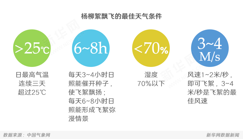 不过,上面所谈到的积温条件只是杨柳絮飘飞的必备条件,但如果在满足上述条件的情况下,突然来了一场大雨,也许就会大大减少空中飞絮的数量了。根据多年的物候观测,当春天白天最高气温连续三天超过25℃,相对湿度在70%以下,天气晴朗且有一定的风时,最有利于飞絮飘扬。一般上午10时至下午16时是飞絮的高发时段。因为随着太阳辐射的增强,气温的升高,气流扰动增强,飞絮就会增多。