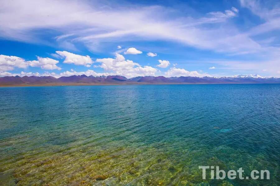 纳木错湖水靠念青唐古拉山的冰雪融化后补给,沿湖有不少大小溪流注入,湖水清澈透明,湖面呈深蓝色,水天相融,浑然一体。