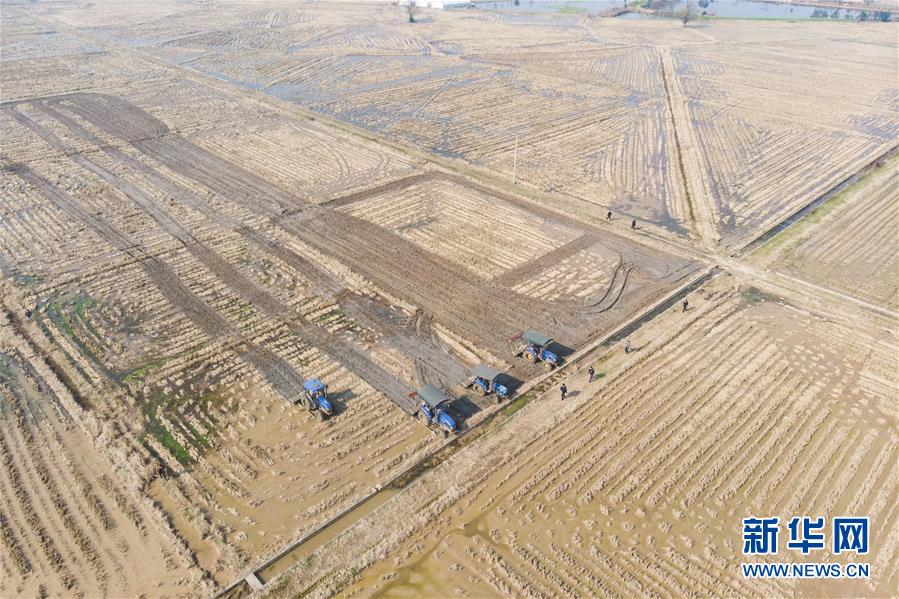 2月20日,在湖南桃源县陬市镇三里铺村,村民驾驶农机翻整稻田(无人机照片)。 正值春耕备耕时节,在湖南省桃源县陬市镇,当地农民在做好疫情防控的同时,开始翻整稻田,为今年的农业生产打基础。 新华社发(陈思汗 摄)