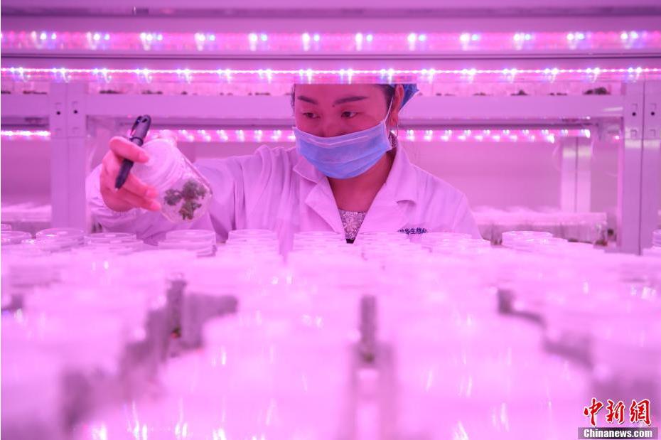 据悉,该构树组培中心是集生产、科研、试验、培训于一体的构树组织培养育苗基地,主要功能是为构树产业发展提供种苗。图为管理员在检查构树组织培育苗生长情况。 瞿宏伦 摄