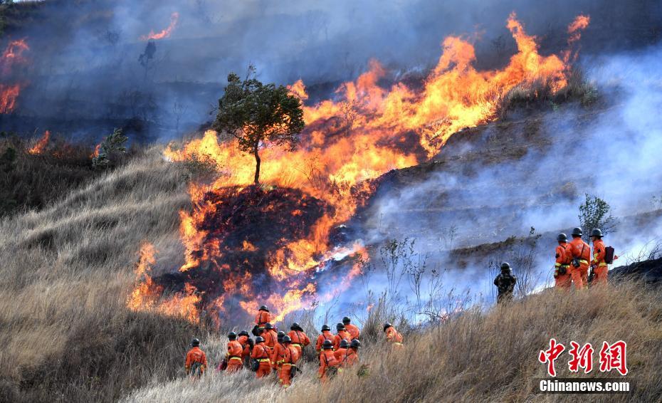 4月20日,四川西昌,山火在风力作用下越燃越大,专业扑火队队员边躲避边扑打。当日14时20分,西昌市樟木箐镇李家沟村突发火情。目前正在全力组织扑救,起火原因待进一步调查。