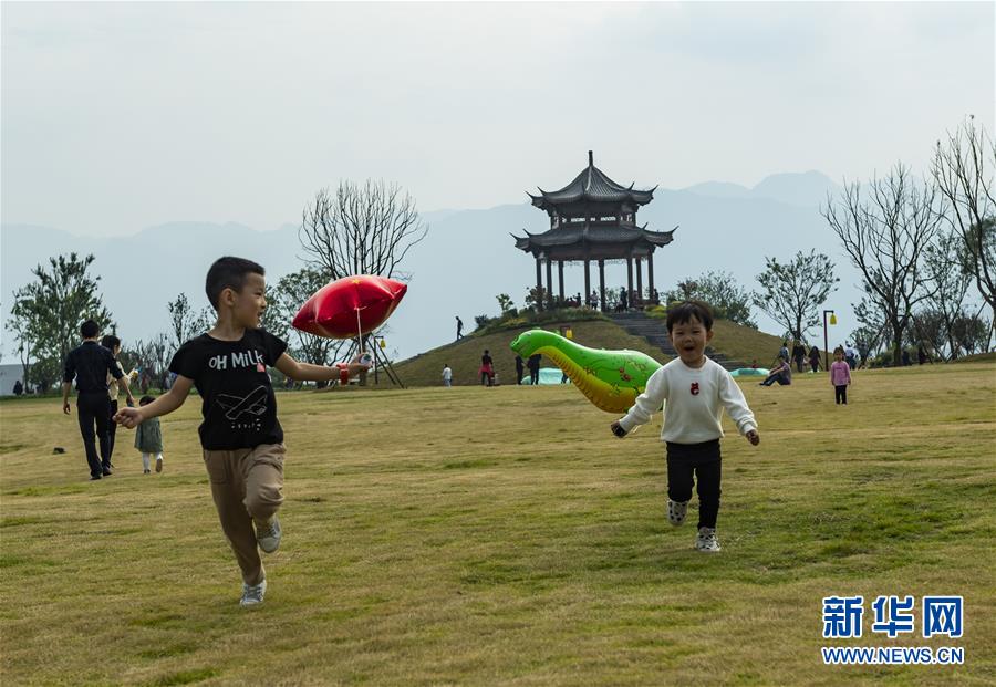 10月1日,小朋友在秭归县木鱼岛休闲公园游玩。 当日,湖北省宜昌市秭归县木鱼岛休闲公园正式对外开放,为三峡库区再添一处旅游观光景点。近年来,秭归县对三峡库区沿线库岸进行岸线复绿、防护加固、环境整治等生态修复,在三峡大坝前构筑起一道美丽的生态屏障。 新华社发(郑家裕 摄)