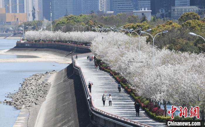 阳春三月,浙江杭州钱塘江畔数千棵樱花树迎来盛花期,烂漫如雪的樱花沿钱塘江岸绵延数公里,成为独特的春日风景线,吸引市民赏花“打卡”,令人流连忘返。