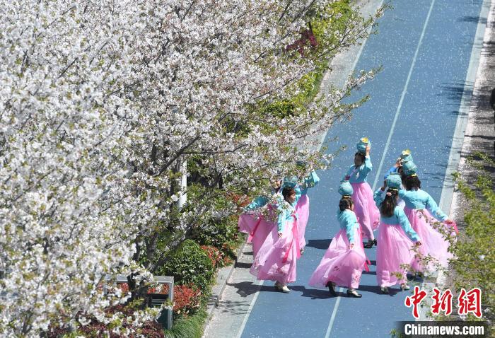 图为:多位市民身穿特色服饰在樱花树下起舞。 王刚 摄