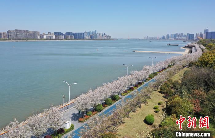 图为:钱塘江堤岸上樱花如雪。 王刚 摄