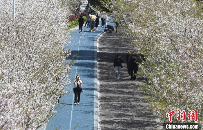 图为:多位市民在樱花树下漫步赏花。 王刚 摄