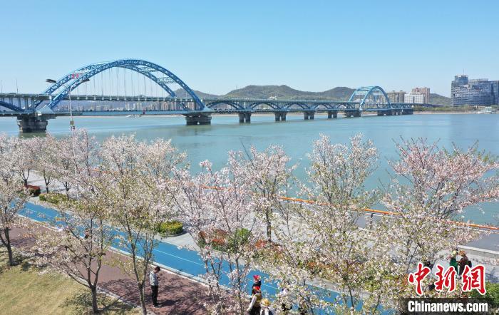 图为:钱塘江边樱花盛放(无人机照片)。 王刚 摄