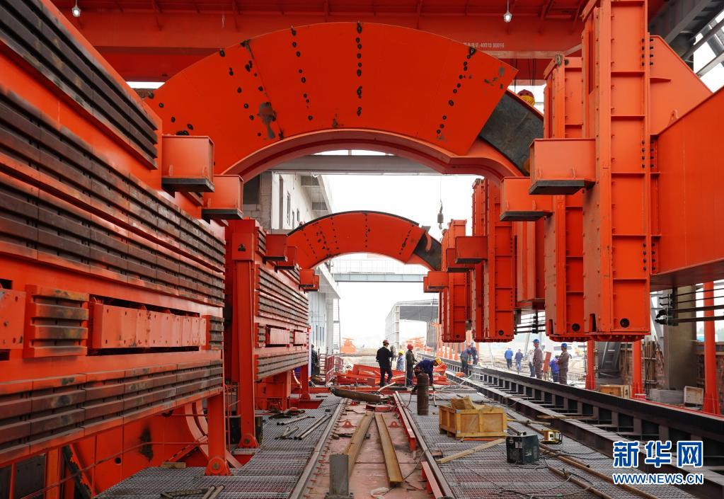 4月29日,工人在滦州市唐山东海钢铁集团有限公司“公转铁”专用线项目的翻车机房建设工地施工。