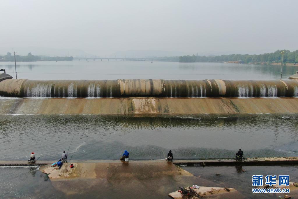 4月22日拍摄的伊河上的橡胶坝,一些钓鱼爱好者在橡胶坝下的河中心钓鱼(无人机照片)。