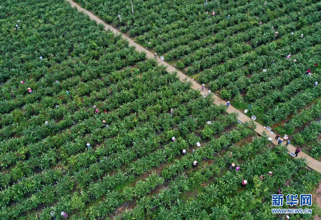 7月8日,村民在重庆南川兴隆镇金花村的蓝莓标准化种植基地采摘蓝莓(无人机照片)。
