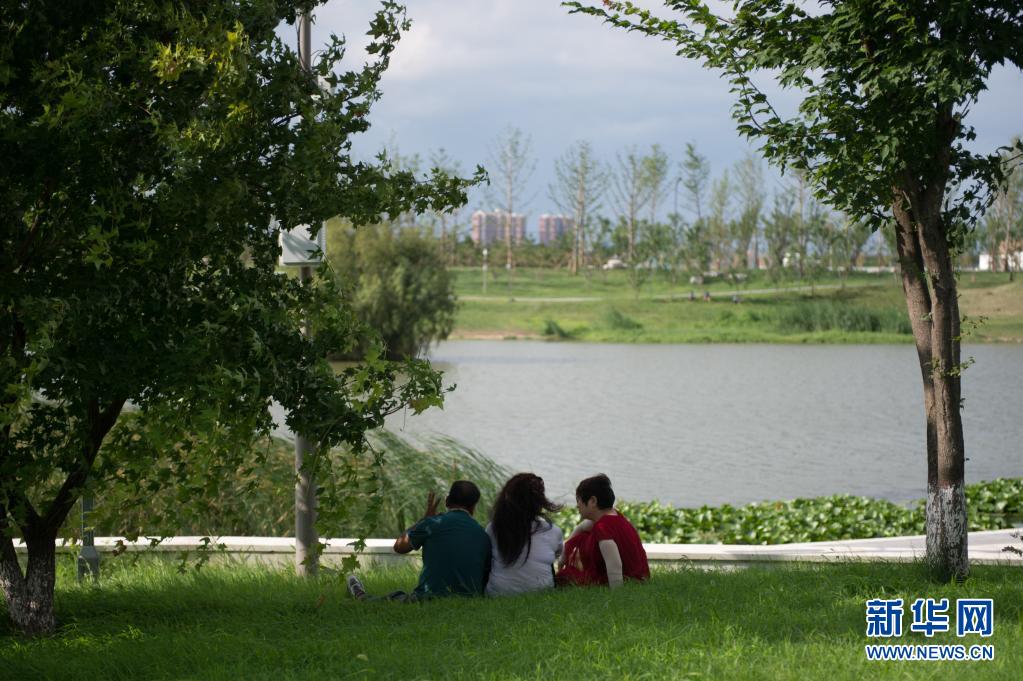 7月20日,人们在沣河河畔休闲。