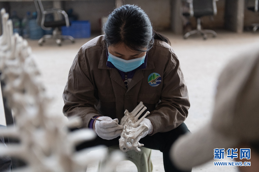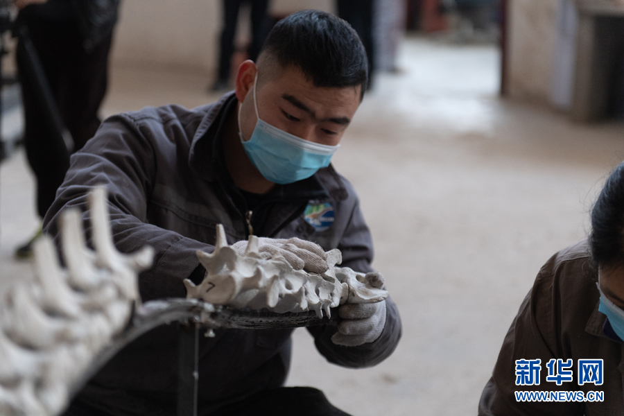 图为工作人员正在对化石进行修复装架。新华网 耿骏宇 摄