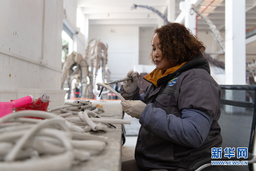 图为化石修复中心内的工作人员在修补复制模型的一些缝隙。新华网 耿骏宇 摄
