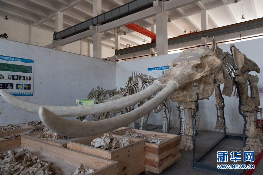 图为化石修复中心展出的大额牛谷式亚种骨架化石。新华网 耿骏宇 摄