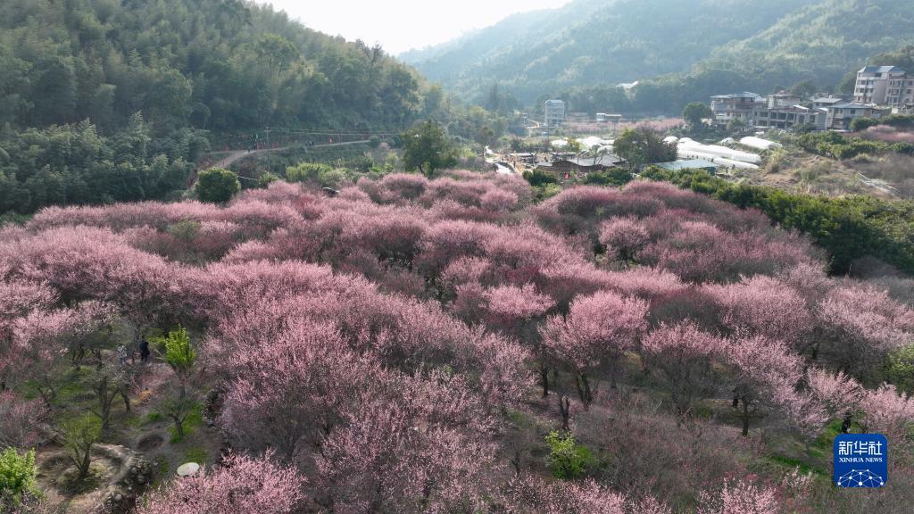 近日,福建省福州市闽侯县荆溪镇关中村古响自然村一百多亩梅花如期盛开,如同彩霞弥漫山间,吸引众多游客前来游玩观赏,给古朴的村落带来勃勃生机。