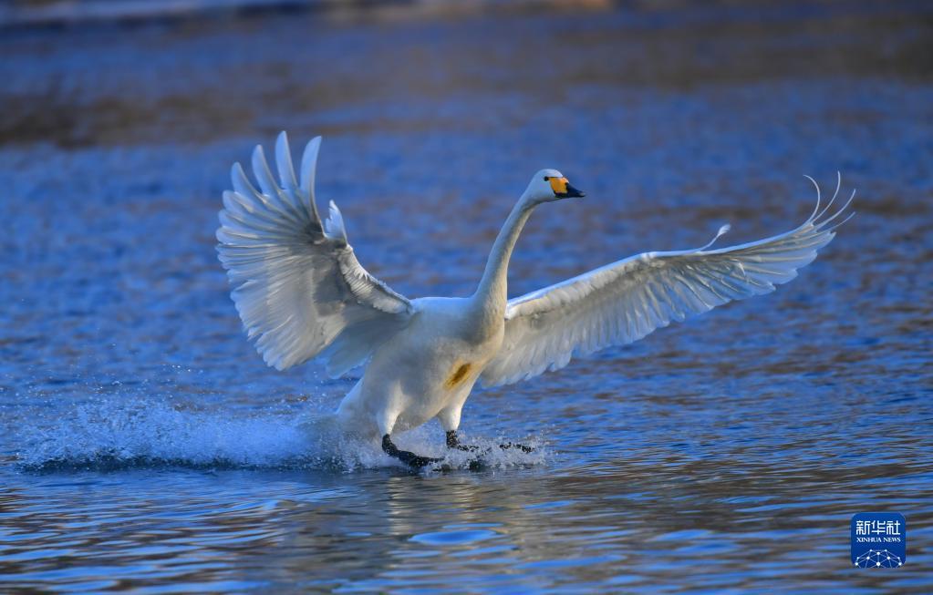 入冬以来,辽宁省北票市八家子乡红村大凌河畔的400多只白天鹅在河水浅滩处嬉戏觅食,吸引人们前来观赏和拍照。
