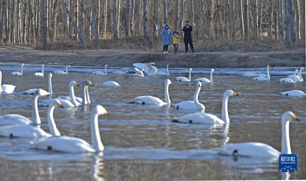 2月21日,游客在北票市八家子乡红村大凌河畔观赏天鹅。