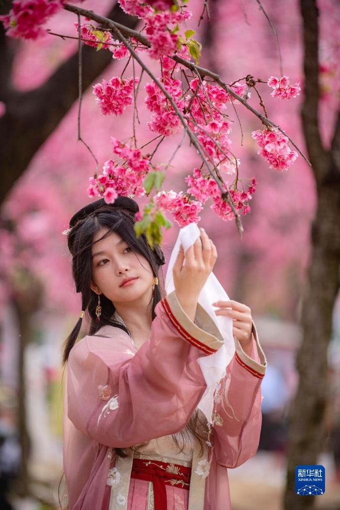 近日,云南昆明圆通山公园的樱花进入盛花期,吸引大批游客前来观赏。