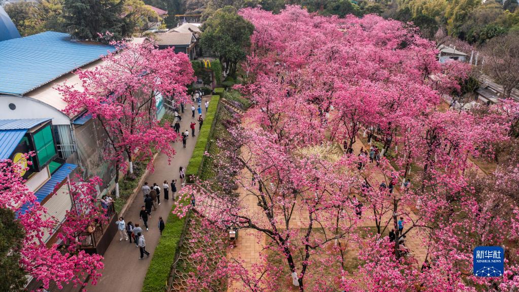 近日,云南昆明圆通山公园的樱花进入盛花期,吸引大批游客前来观赏。
