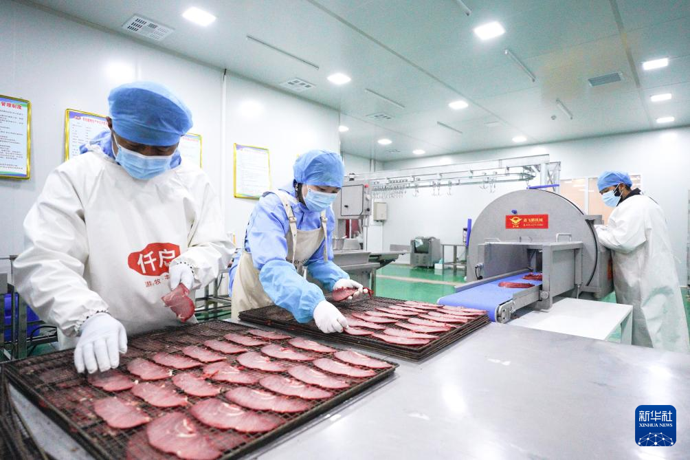11月11日,工人在仟户牧场的加工车间制作零食产品。