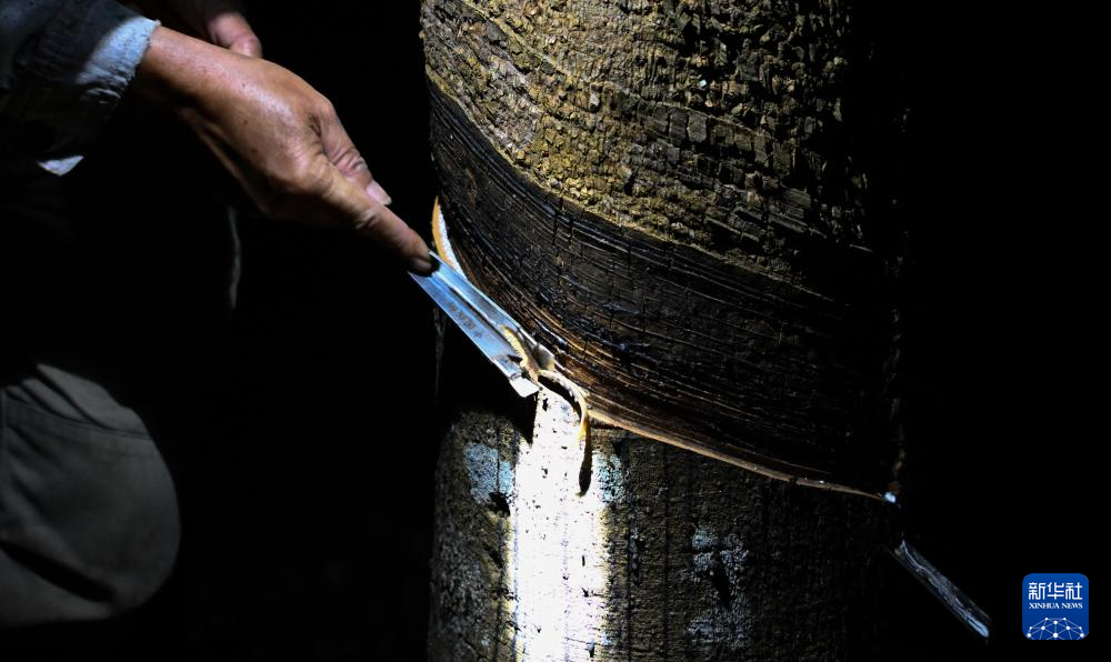 海南省白沙黎族自治县牙叉镇新高峰村的胶农在割胶(11月19日摄)。