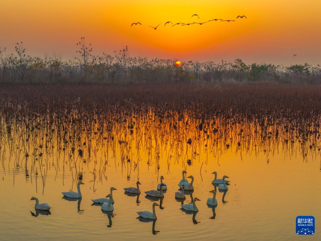 11月30日,群鸟在江苏兴化里下河国家湿地公园内栖息、觅食(无人机照片)。
